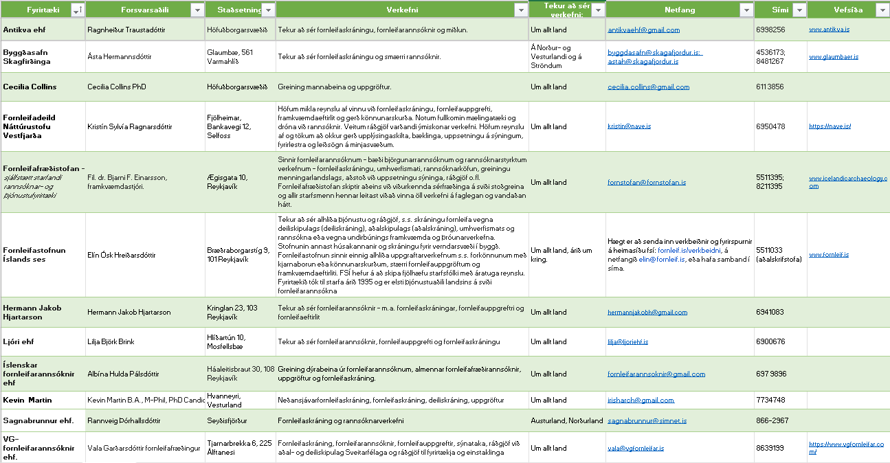 Starfandi fornleifafræðingar og fyrirtæki.